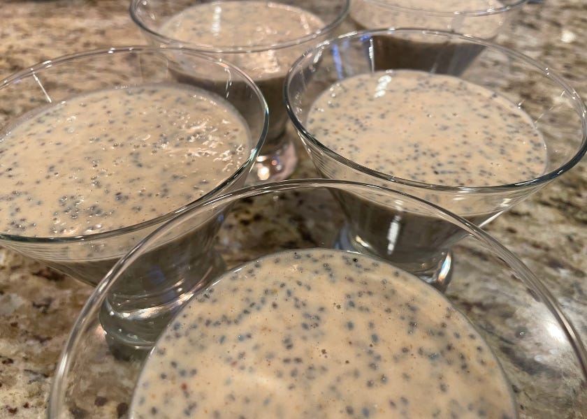 Using your immersion blender, combine the almond milk, chia and basil1 seeds, vanilla, peanut butter and caramel sauce.2 Divide the pudding into your serving dishes, cover with plastic wrap and refrigerate for 3+ hours. The pudding will thicken as the chia and basil absorb moisture from the milk.
